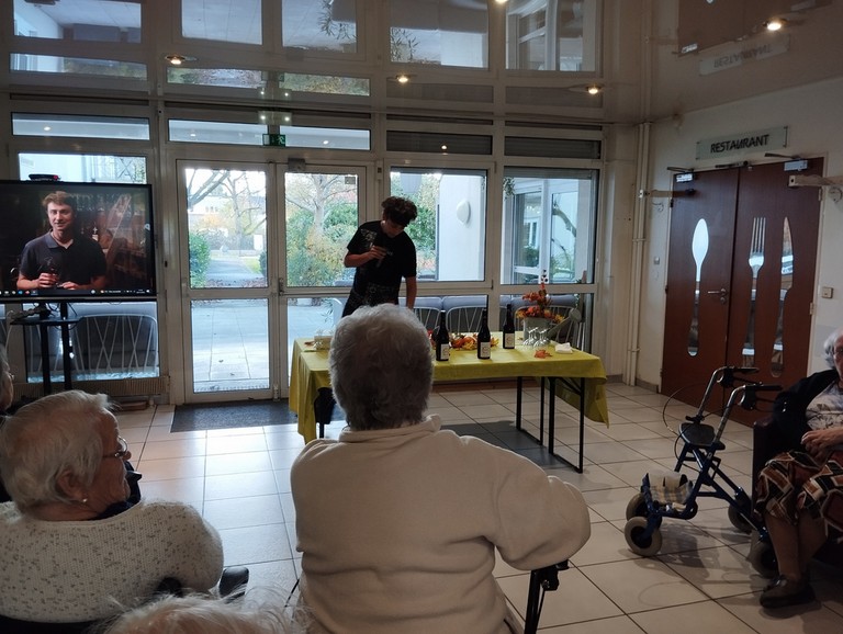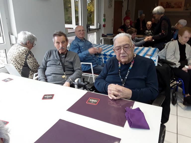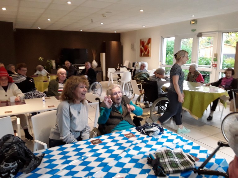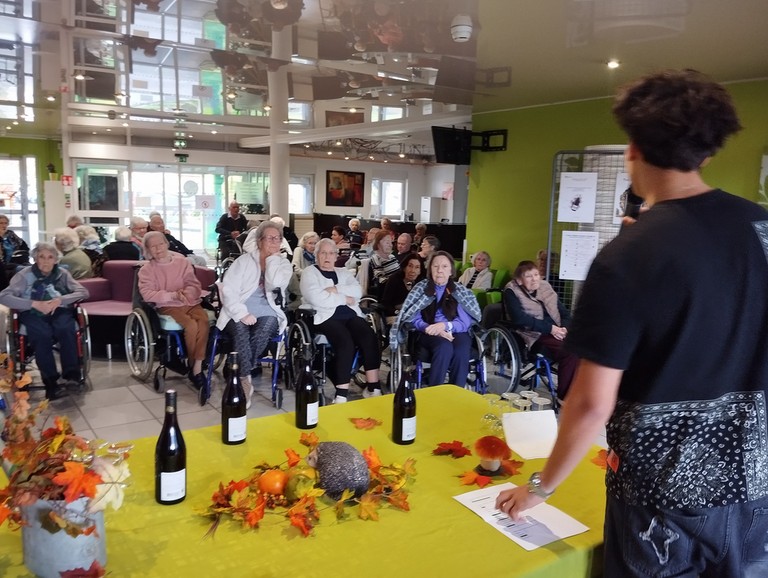 Pour célébrer l’arrivée du beaujolais nouveau dans les étales le 3ème jeudi de novembre, le chef de cuisine a organisé un apéritif dans le hall à 11h animé par Théo (stagiaire animation) et son quizz. Cette année, les résidants lui ont trouvé une note de banane et une belle robe rouge.