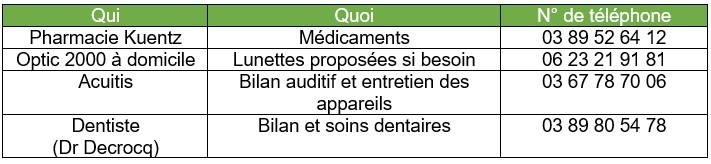 Pour prendre rendez-vous ou toute demande d’informations sur la prise en charge d’un résidant vous pouvez contacter directement les intervenants concernés.